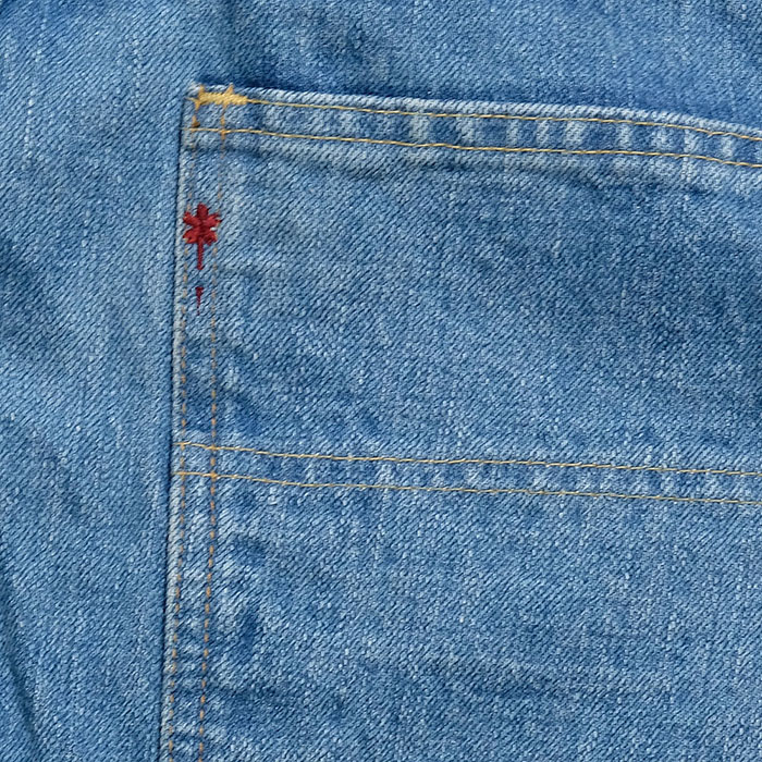 ビッグジョンの定番2本針ポケットステッチに加えて、バーガスプラスの桜の待ち針刺繍がアクセントになっています。