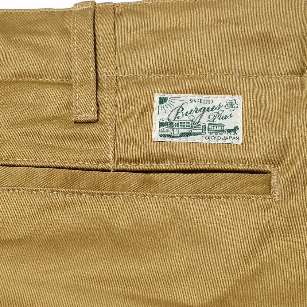 Burgus Plusのトップセラーアイテム。高級感のある光沢としなやかさを持ち、しっかりとした手持ち感のあるウェストポイントチノクロスを採用。股上をやや浅めに設定し、綺麗なテーパードを描いた美しいシルエットです。腰まわりのおさまりとキレイなラインはまさに現代のチノパンにふさわしい1本です。