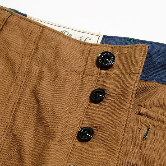 シルエットは股上も深く、ゆったりとしたデザイン。素材にはしっかりとした光沢感のある高密度に織り上げたバックサテンを使用。ステッチワークはボディーと同系色でまとめ上げ、ボタンにはブラック塗装のタックボタンを採用している。内側には旧式の力職機に使用されるシャトルのデザインをあしらった布製のパッチを使用。