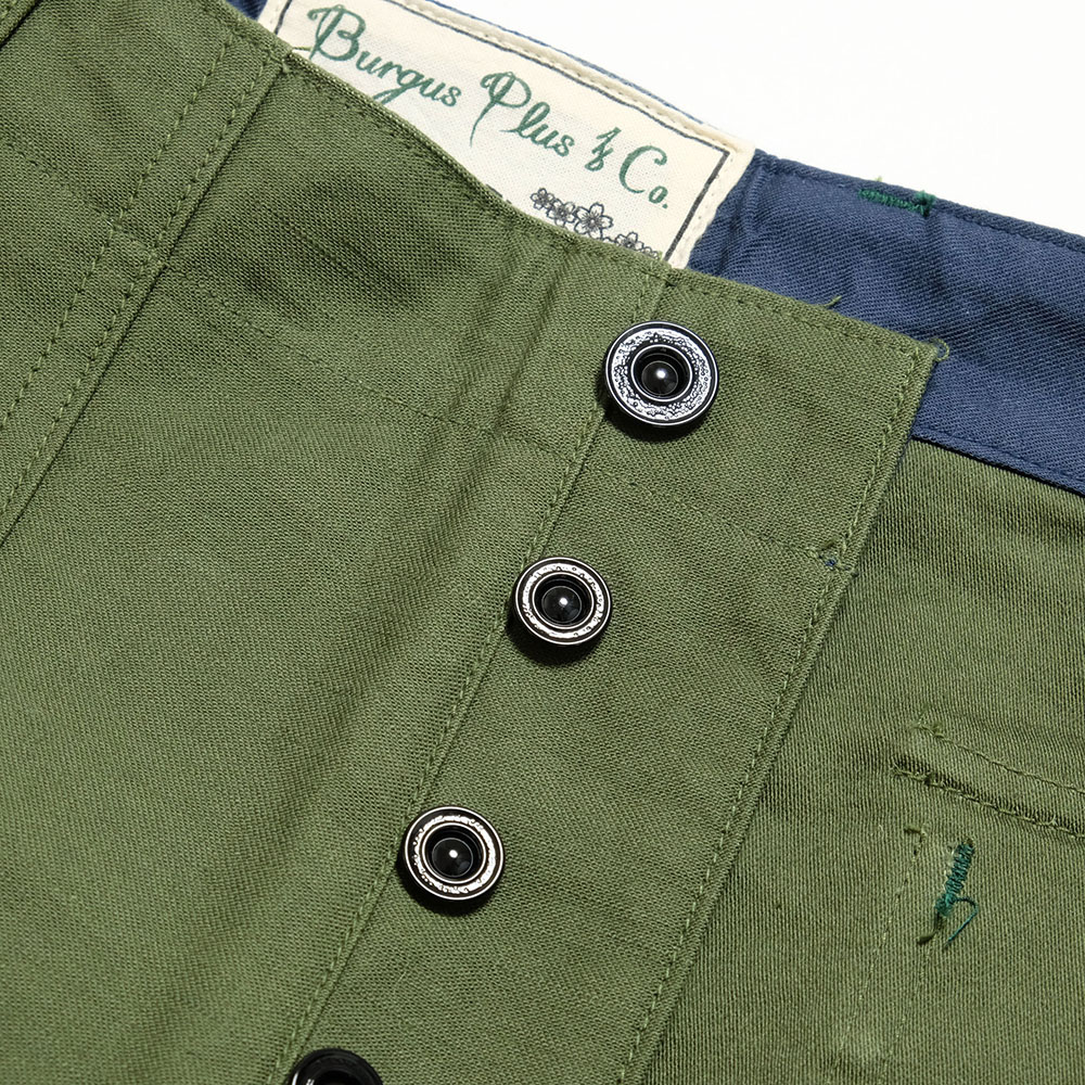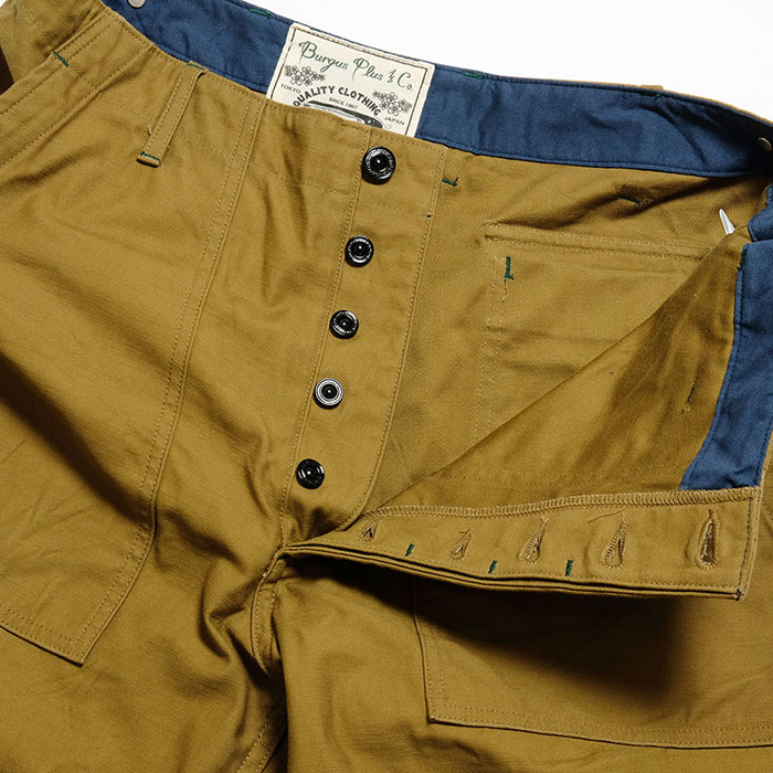 その特徴でもある大きなポケットと太めで無骨なシルエットをベースに、Burgus Plus流のエッセンスを加え、作り上げた一本。シルエットは股上も深く、ゆったりとしたデザイン。素材にはしっかりとした光沢感のある高密度のバックサテンを使用。細部にまで拘ったディティールとミリタリーパンツの心地よさが感じられる一本に仕上がっています。