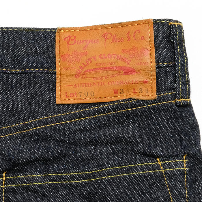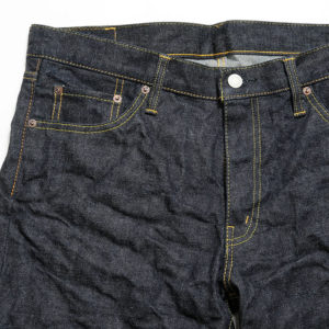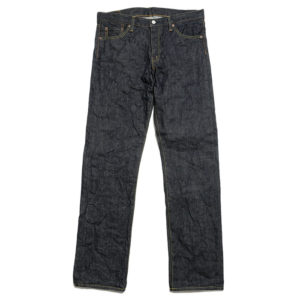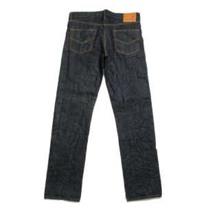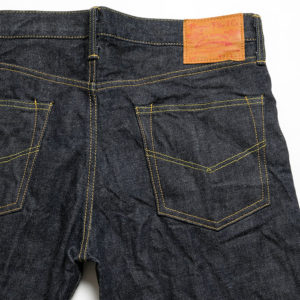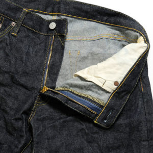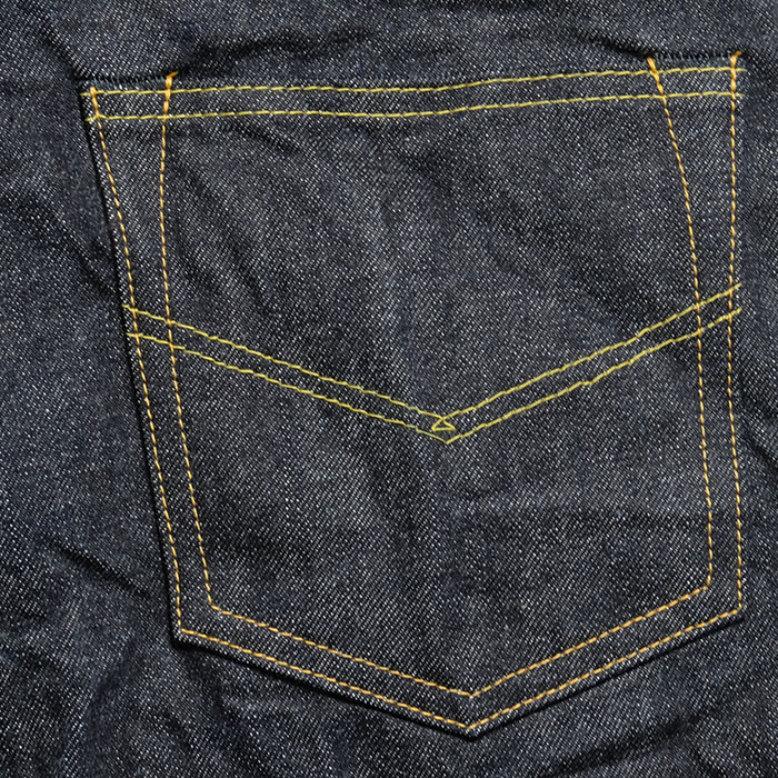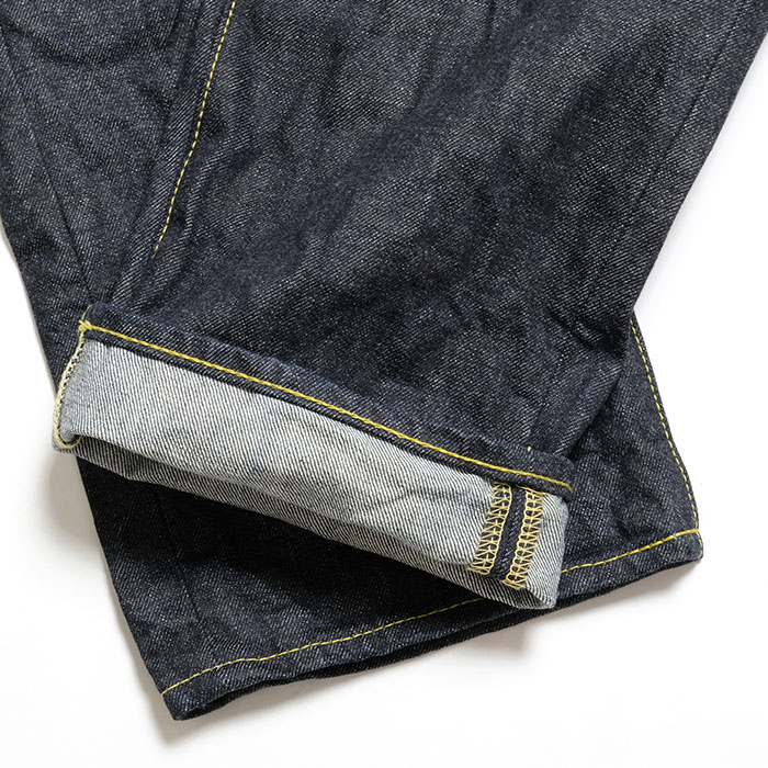 タテ糸に6.8番手のムラ糸を使用し、ヨコ糸を極限まで打ち込んだ頑丈なノンセルビッチデニム。ロープ染色で丁寧に染色を重ね、ダブルダイする事により、特濃色のデニムに仕上げています。長く愛用する事によりメリハリのある独特の色目になるデニムです。ややタイト目に作られたヒップラインにより、細身の綺麗なシルエットを生み出しています。