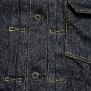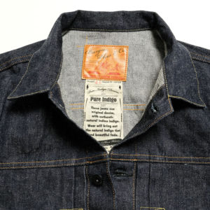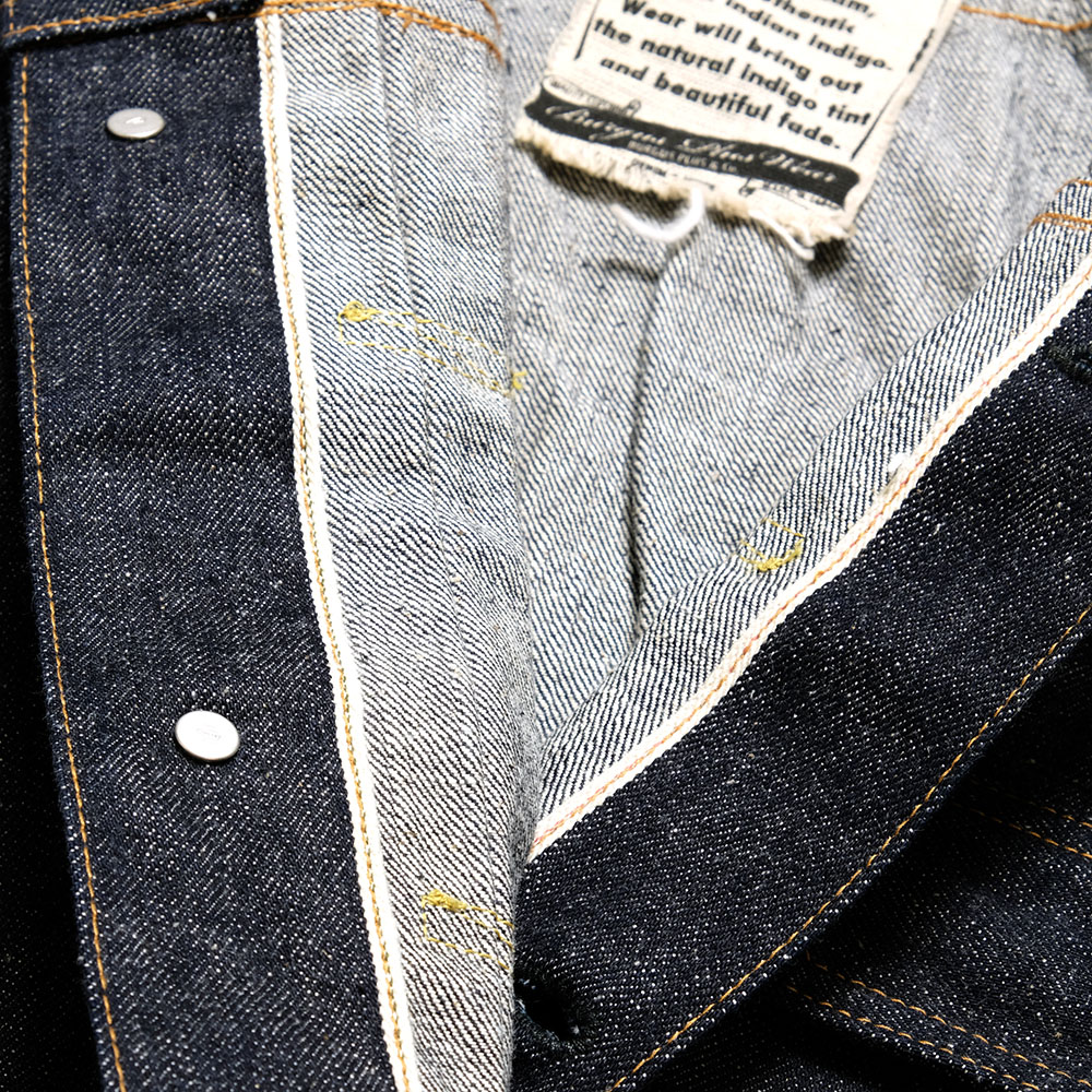 生地は天然藍を使用してロープ染色によって染め上げたインディゴ糸を使用。3種類の太さの糸を使うことにより、凹凸感のある、14oz相当のセルヴィッジデニムです。