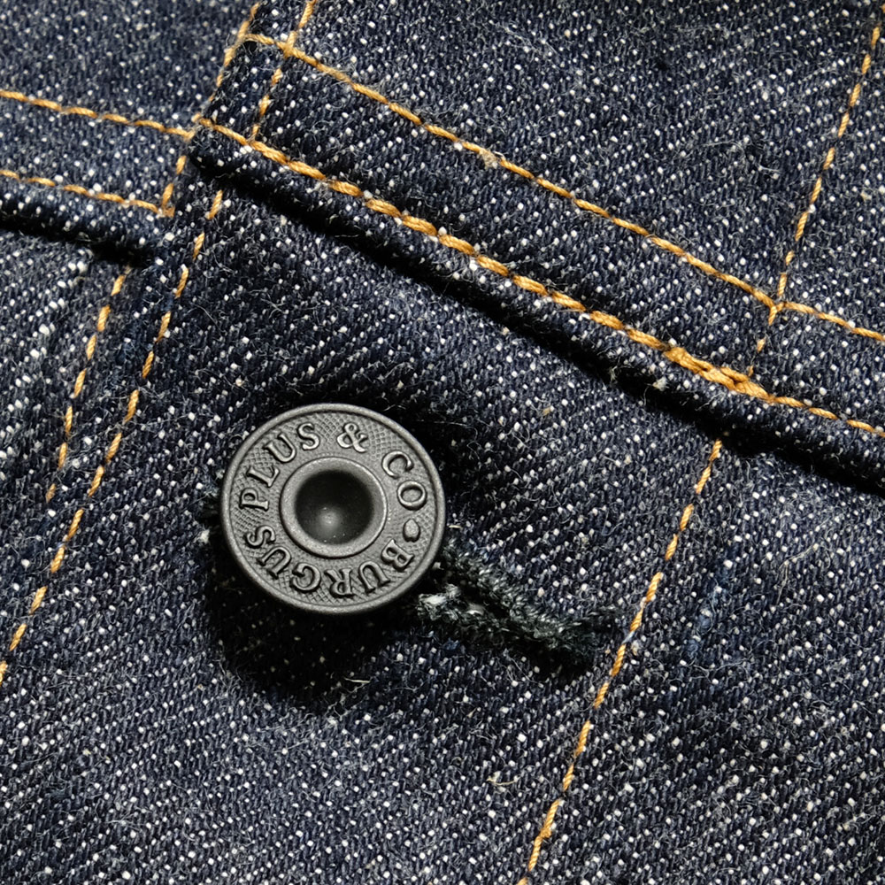 デザインは、時代背景に沿った通称「1st ファースト」と呼ばれるフラップ付きワンポケット。フロントプリーツ、シンチバック、袖口のあき位置などビンテージのディテールをしっかりと踏襲しながらも、ポケット角の補強革、フロントプリーツの留めのボックスステッチ、さらにはシルエットの見直しなどBURGUS PLUS流に進化させたデニムジャケットです。