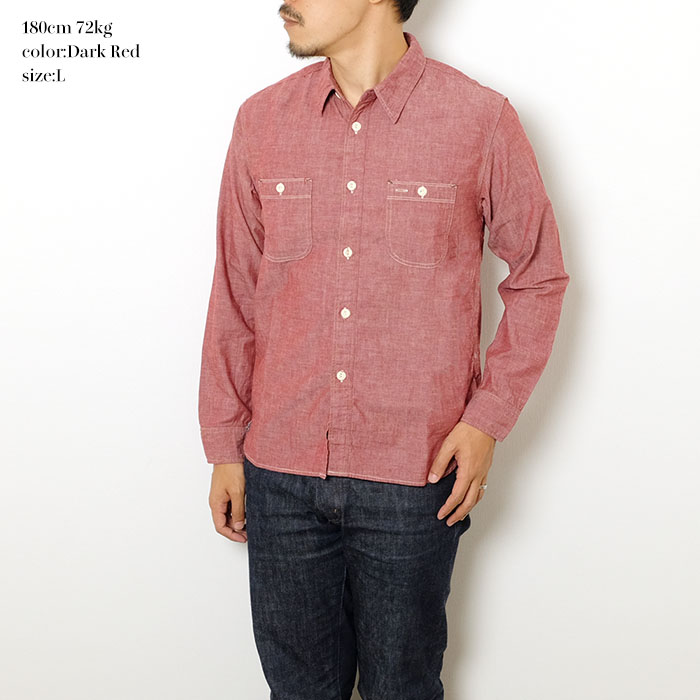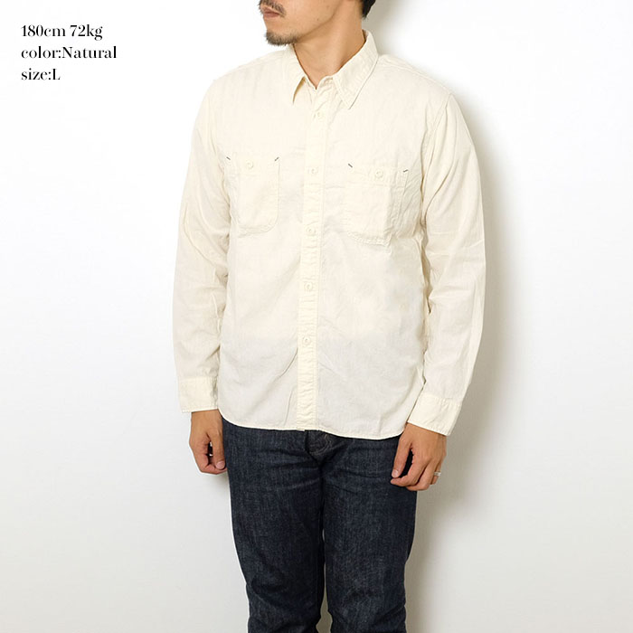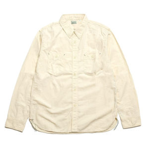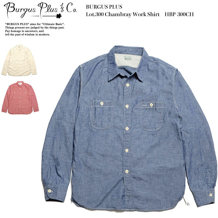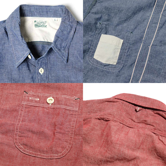 ペイントしたメタル猫目ボタンは、削れることで下地が覗いてきます。トリプルステッチ、マチ付き、ペンホルダーなど、ヴィンテージのディティールを踏襲し、更に負荷のかかりやすい肩口にかけて裏に補強布を施しています。小ぶりな襟、程よいゆとり感のあるシルエットなど、BURGUS PLUSらしいベーシックを体現したシャツに仕上がっています。