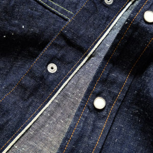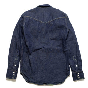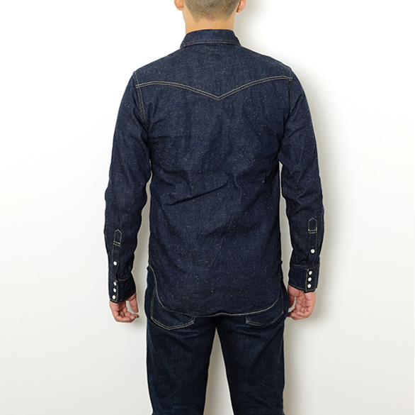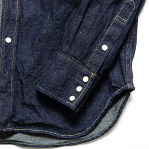 BURGUS PLUSが作り上げたウエスタンシャツは、ネップのある耳付きの9ozデニムを使用。凹凸感があり、ネップ特有の白点が表面感を演出しています。また、度詰で織られたデニムは9ozという響き以上にどっしりとした生地感でウエスタンシャツ本来の丈夫さも兼ね備えています。